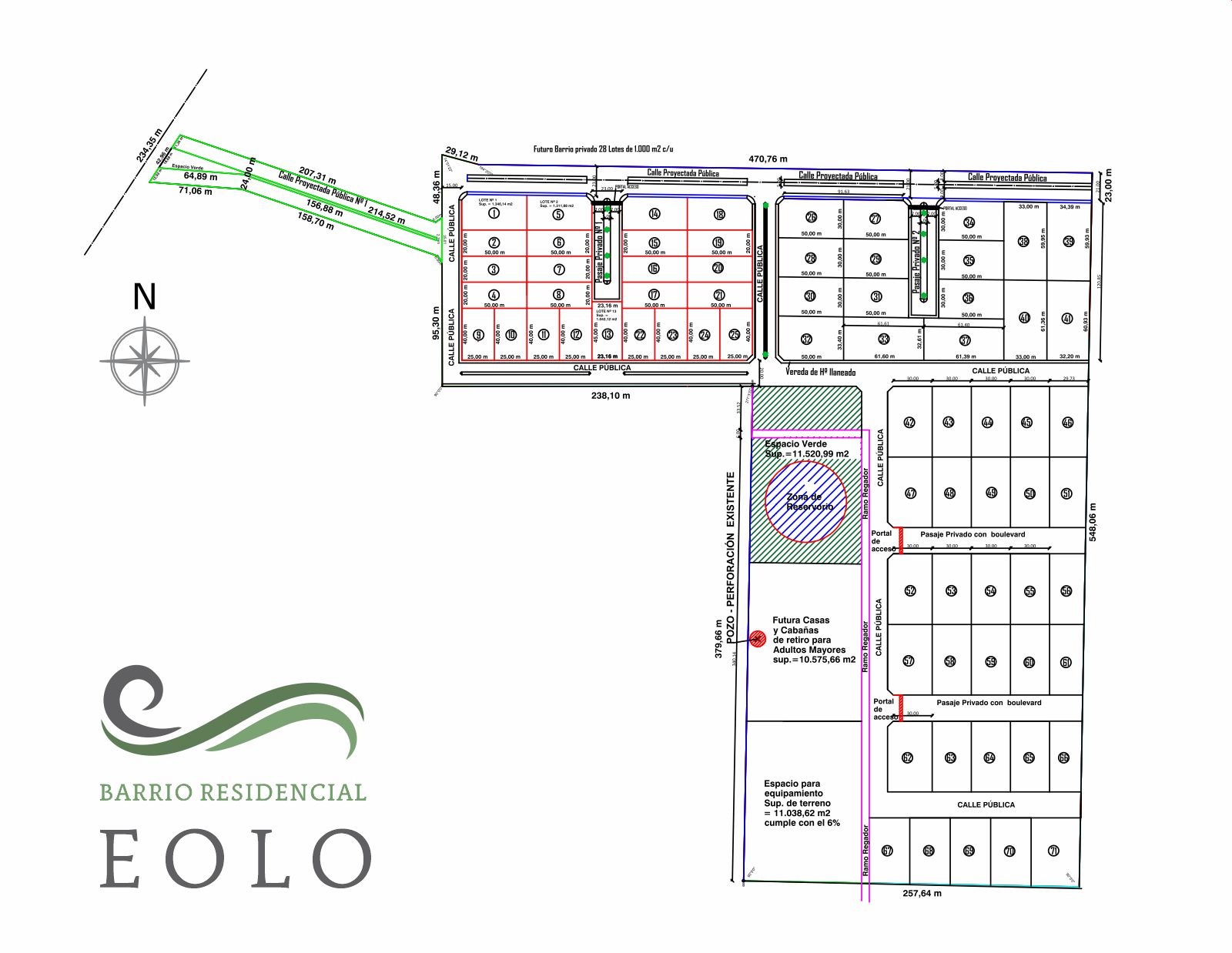 Barrio Residencial Eolo está compuesto por barrios abiertos y barrios cerrados los cuales cuentan con lotes de 1000 y 1500 mt2. Además, se proyectan canchas deportivas de rugby, fútbol y pádel, como así también espacios verdes de recreación para toda la familia.